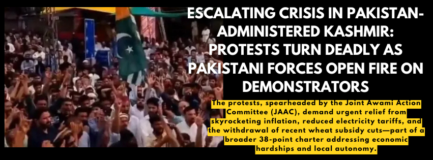 In a dramatic escalation of long-simmering grievances, thousands of residents in Pakistan-administered Kashmir, also known as Azad Kashmir or Pakistan Occupied Kashmir, took to the streets today in what organizers described as an “indefinite shutter-down and wheel-jam” strike. The protests, spearheaded by the Joint Awami Action Committee (JAAC), demand urgent relief from skyrocketing inflation, reduced electricity tariffs, and the withdrawal of recent wheat subsidy cuts—part of a broader 38-point charter addressing economic hardships and local autonomy. What began as peaceful demonstrations against the Pakistani government’s policies has now spiraled into violence, with reports confirming that security forces opened fire on crowds, resulting in at least two deaths and over 20 injuries.